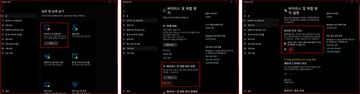 모든 백신 프로그램은 환경설정 > 실시간 감시 비활성화 기능이 있습니다.
