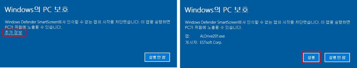 Windows의 PC 보호는 윈도우 정책에 의해 차단 된 것으로 클라이언트 오류가 아닌 점 안심하시고 아래와 같이 진행하면 설치 진행이가능합니다.